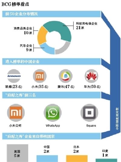 谁是中国最具创新性公司?10月30日,波士顿咨询集团(BCG)发布2014年最具创新力的50大公司榜单显示,中国共有四家企业榜上有名。排在23位的联想集团带领着小米公司、腾讯以及华为共同进入该榜单。