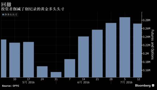 根据商品期货交易委员会(Commodity Futures Trading Commission)滞后三天公布的数据,在截至7月12日的一周里,黄金期货和期权净多头头寸减少了5.4%,至271,529份合约。此前一周达到286,921份合约,创下2006年有数据以来的最高水平。