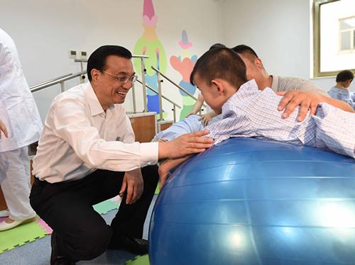 2014年5月,看望正在进行康复训练的孤残儿童。总理说,“相信关爱你的人们”,将来一定会走得更快更好。