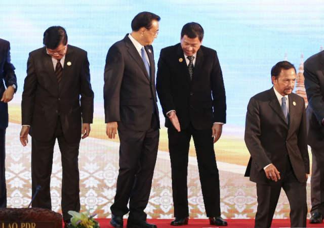 不过,各界最为关注的,还是此前一天下午的东盟-中日韩(10+3)领导人会议前后,李克强与菲律宾总统杜特尔特的两次过道交流。会前的领导人合影环节结束后,杜特尔特穿过多位参会领导人来到李克强身边握手,随后又伸出左手“请”李克强总理先走。会议结束后,两位领导人在会场内再次进行了简短寒暄。