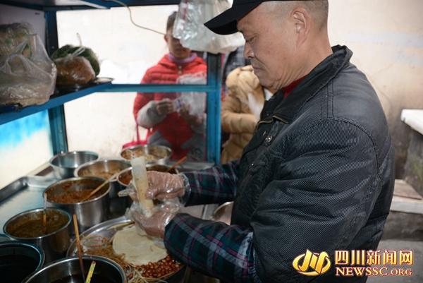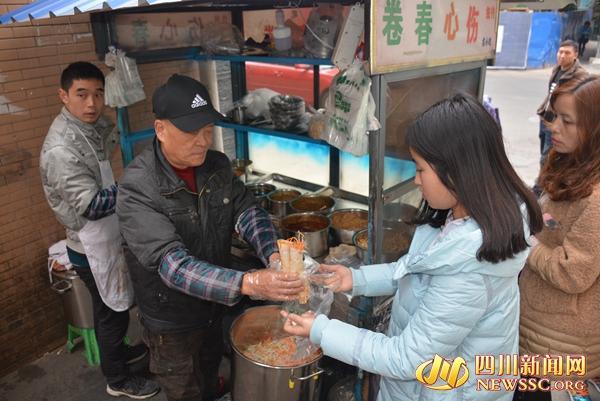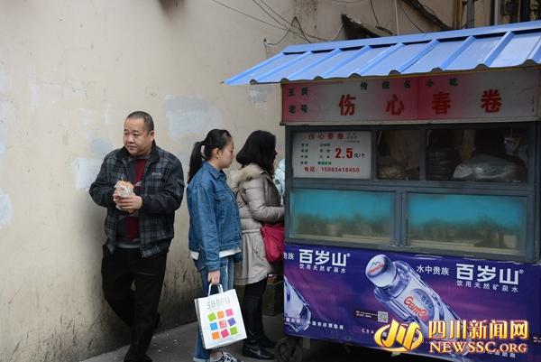 四川新闻网记者在现场看到,王诗云的顾客不仅有十几二十岁的年轻人,还有四五十岁的中年人,有的还开着车子来到他的小吃摊前买春卷。