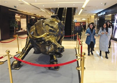 昨日,金融街购物中心里的金牛雕塑。图/视觉中国