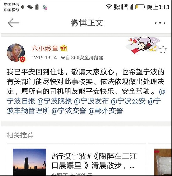 晚上7点14分 ,@六小龄童的个人微博也更新了最新情况:我已平安回到住地,敬请大家放心,也希望宁波有关部门能尽快核实此事,依法依规做出处理决定,愿所有的司机朋友能平安快乐、安全驾驶。