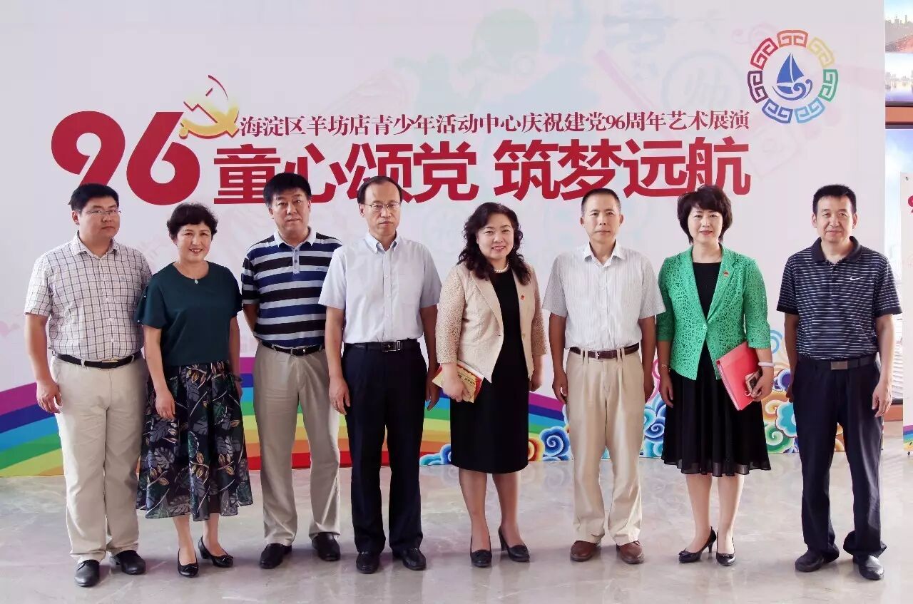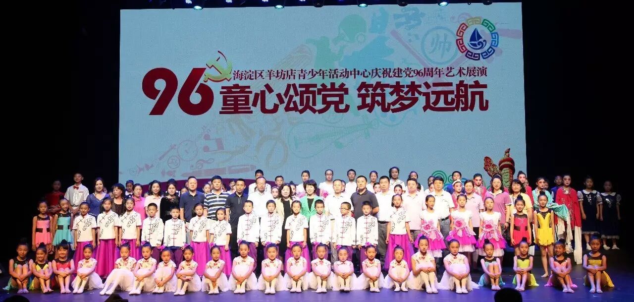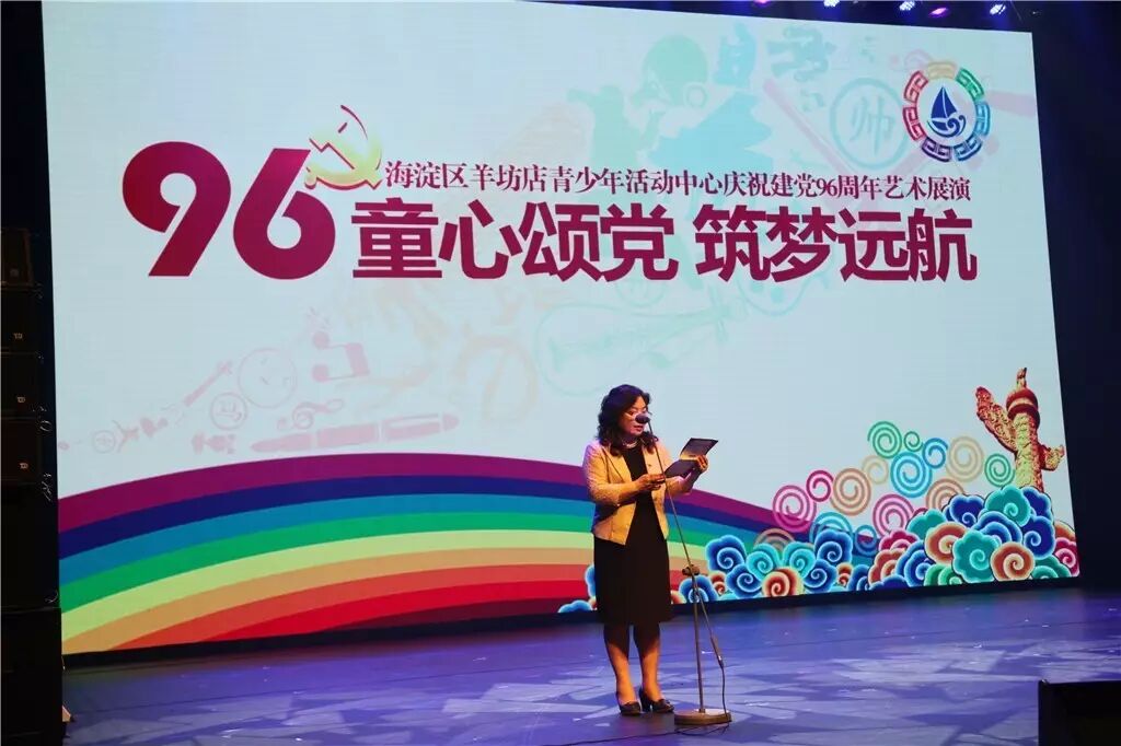 海淀区教工委书记尹丽君首先致辞,她表示:“在中国共产党96周年华诞之际,恰逢北京市第十二届党代会胜利闭幕之时,喜迎党的十九大欢乐祥和之际,海淀区羊坊店青少年活动中心隆重集会,广大青少年以艺术展演的形式庆祝党的生日,重温党的光辉历史,讴歌党的丰功伟绩,传承红色经典,践行社会主义核心价值观具有重大意义。校外教育在培养青少年的兴趣爱好、个性特长、实践能力,提升青少年综合素质及创新人才培养方面发挥着重要的作用,希望校外教育工作者坚守阵地、履行职责,为培养全面发展的建设者和接班人无私奉献,为中关村金色品牌培养创新型人才,办人民满意的校外教育做出贡献。”