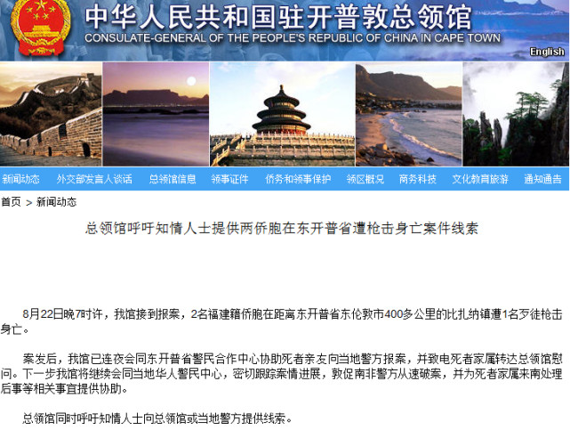 中新网8月24日电 据中国驻开普敦总领馆网站消息,当地时间8月22日晚7时许,总领馆接到报案,2名福建籍侨胞在距离东开普省东伦敦市400多公里的比扎纳镇遭1名歹徒枪击身亡。