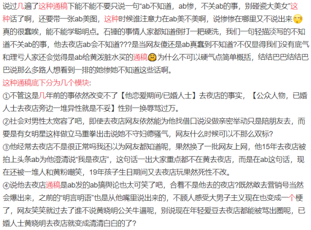 在多个Baby的粉丝发文中都发现了类似的模板,不约而同的针对黄晓明去夜店一事,哪怕黄晓明工作室已经对此澄清风波了,但目前依然有大量网友在质疑黄晓明,两者想结合起来恐怕有一定关联。