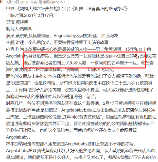 2月20日,有知情人爆料表示,Baby粉丝近几天有异常动作,大粉甚至在Baby话题下发出了抹黑黄晓明的模板,在模板中能看到针对黄晓明去夜店的相关说辞,把婚姻问题全部都放在黄晓明身上。