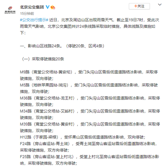 据@北京公交集团 消息,近日,北京及周边山区出现雨雪天气,截止至19日7时,受此次雨雪天气影响,北京公交集团共计24条线路采取临时措施,具体线路及措施如下: