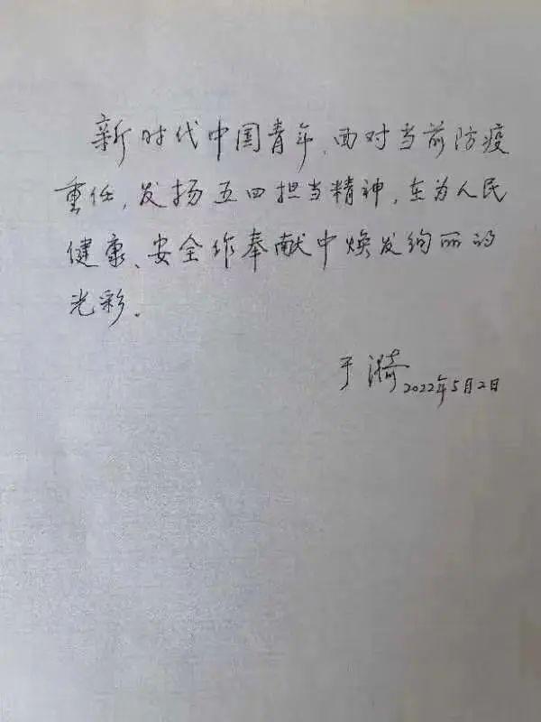 5月,向来是诗歌和鲜花绽放的季节。今年5月4日,是中国共产主义青年团的百年华诞。5月2日,人民教育家于漪也情系后辈,专门提笔写下精致寄语——“新时代中国青年,面对当前防疫重任,发扬五四担当精神,在为人民健康、安全作奉献中焕发绚丽的光彩”!乌南青年顿受鼓舞。