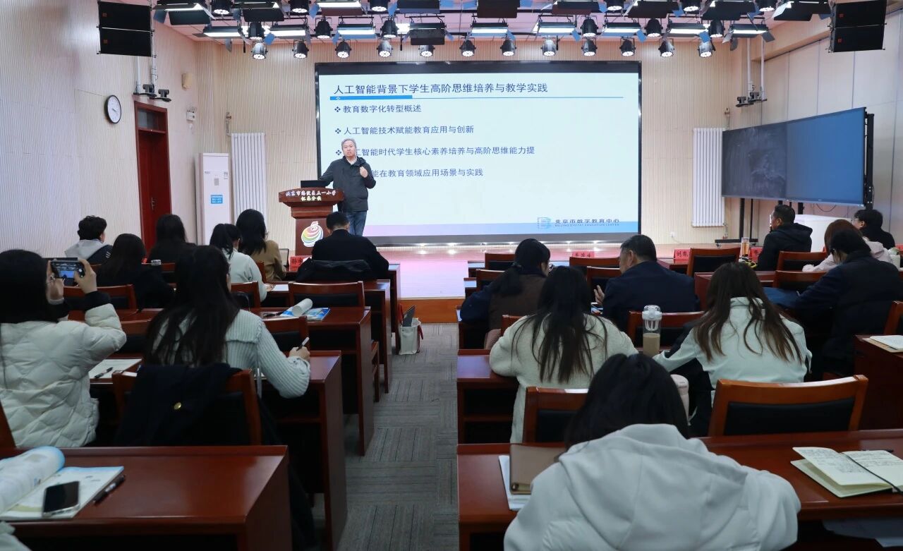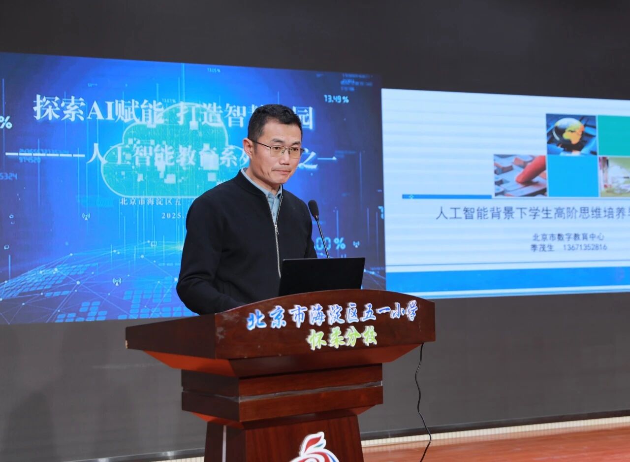 根据《北京市推进中小学人工智能教育工作方案 (2025—2027年)》等文件精神,积极落实人工智能在校园的应用。3月11日,北京市海淀区五一小学怀柔分校举办 “探索 AI 赋能打造智慧校园” 系列培训首讲活动。此次活动特邀北京市数字教育中心资源发展部季茂生主任主讲,怀柔区电化教育管理中心王志刚主任、郭爽副主任、刘胤哲副主任,教育技术部孙宇婷主任等专家出席,五一小学怀柔分校全体干部、骨干教师和青年教师齐聚一堂,共同开启 AI 与教育融合的探索之旅。